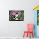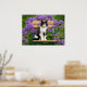 Un mignon chat bicolore noir et blanc, European Shorthair, assis sur une chaise en bois devant des fleurs de jardin violet. Photo Katho Menden. Cette affiche est une idée cadeau pour les amoureux de les chats.