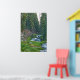 Photo d'un cerf mâle posé dans une zone ouverte avec de l'herbe et des fleurs sauvages, à côté d'une rivière en cascade dans une forêt. Copyright© 2018 Kimberly J Tilley.