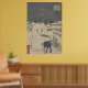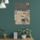 Hirokage's ukiyo-e print "Comic Incidents at Famous Places in Edo, No. 22", montrant un chien joueur voler le repas d'un ouvrier d'une Daruma neige. Une oeuvre japonaise du XIXe siècle animée, idéale pour les affiches, les tasses et bien plus encore.