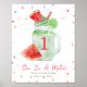 thème "un dans un melon" 1er anniversaire avec illustration d'un smoothie à la chaux de pastèque dans un bocal de mason entouré de confettis.