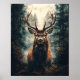 Une scène puissante et dramatique d'un wapiti debout fièrement dans les bois, ses majestueux bois qui s'élèvent au-dessus de la forêt dense. Les ombres profondes et l'atmosphère brumeuse autour du wapiti créent un sentiment de mystère et de force, capturant la beauté brute de la nature.