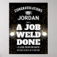 Ajoutez une touche personnalisée élégante aux décorations de fête de fin d'études de soudage avec l'affiche personnalisée "A Job Weld Done". Tout le texte sur ce modèle de panneau est simple à personnaliser. Le design noir et blanc présente une torche de soudage avec des étincelles, une fausse planche de mortier en acier inoxydable et une typographie moderne et audacieuse pour le nom du diplômé, l'année de promotion et l'école. Veuillez noter que le capuchon de graduation argenté est une couleur imprimée, et non une feuille métallique. Le design de citation drôle élégant apporte une touche amusante et unique à la célébration de la remise des diplômes d'un soudeur. Félicitations au diplômé !