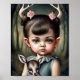 Le lien entre une petite fille et son ami furieux. Une jeune fille tient un cerf dans les bras. La fille porte une robe bleue et a une paire de cornes sur la tête. La scène se déroule dans une forêt, avec des arbres entourant la fille et le cerf