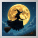 Une sorcière volant sur son balai devant une pleine lune sur l'affiche de la nuit d'Halloween.