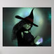 Une sorcière souriante habillée tout de noir vêtue d'un grand casquette noir jette un sort orbital.