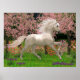 Un légendaire étalon blanc de licorne gèle à travers une forêt de fleurs et de cerisiers.