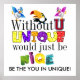 En tant qu'adulte, je me rends compte que nous ne pouvons pas simplement dire aux enfants/jeunes adultes combien il est important d'être "soi-même". Je n'aurais probablement pas écouté ; pourtant, je vois maintenant que j'ai eu de la chance, pas tant en ce sens que j'ai pris position ou que j'étais indépendante ; cependant, j'ai traversé la vie en me concentrant sur ce que j'étais à l'époque, donc ça a bien marché. Plutôt que d'être le pom-pom girl (ce qui est une grande chose d'être) qui voulait sortir avec mon copain de lycée qui était la BMOC, j'étais dans l'équipe de débat, a couru la piste, un artiste, etc. qui a daté la BMOC tout au lycée ... et était la princesse de retour. Dans mon premier collège (pour les femmes en Virginie), pour accéder à ma classe d'anglais de 8h00, j'ai dépassé la moitié de mes amis qui ont été inspirés de protester après que Gloria S. nous ait donné des conférences (et j'étais celui qui avait du chocolat chaud avec elle la veille) .... Plutôt que d'aller avec la foule, je voulais mon A dans cette classe que j'avais méritée. Je n'étais pas intentionnellement "unique" ; au contraire, j'ai simplement fait les choses à ma façon. Dans mon 2ème collège d'Az, j'étais le seul membre de la sororité du département d'art et le seul majeur de l'art de la sororité. C'est venu facile pour moi, et je ne sais pas la réponse pourquoi ... Ça m'a frappé pendant que je tape ça, peut-être que c'était de la confiance. Alors.... point étant, peut-être si nous pouvons au moins nous rappeler (surtout en tant qu'enseignants où les enfants sont entourés de pairs) de faire savoir à chaque enfant que chacun est fabuleux pour qui il / elle est, chacun a une qualité spéciale (unique) qui vient de l'intérieur par opposition à des pairs, chaque enfant brille sur ses propres mérites ... construire cette confiance, et espérons que l'enfant sera à l'aise d'être unique! Il suffit de dire ... : ) En vieillissant, ils entendront trop souvent qu'il n'y a pas de moi dans TEAM; pourtant, la façon dont je vois que c'est une bonne équipe a besoin d'individus UNIQUES. Les équipes sportives ont besoin du quarterback, mi-back, short, pitcher (chacun unique). La société a besoin du PDG, du département financier, du département technique, des ventes (chaque unique) ... : ) J'ai payé les frais de licence étendus pour utiliser chaque image ici pour vous! ... Profite. Merci, Sharon Rhea Ford, NBCT - ART(www.zazzle.com/sharonrhea*) S'il vous plaît me Signet et venez à Zazzle via mon lien ! Merci .