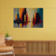 This dynamic abstract artwork captures the energy and rhythm of a modern city through towering vertical forms and bold architectural silhouettes. Warm tones of amber, rust, and deep red rise alongside cool blues and charcoal grays, creating a powerful contrast that evokes skyscrapers bathed in shifting light. Dripping paint and textured brushstrokes add a sense of motion, as if the city itself is breathing, pulsing, and constantly evolving.