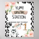 Pink Floral Cow with Cow Print Birthday Party Signale fête d'anniversaire à thème vache mignonne avec et vache noire et blanche, arrangements floraux roses, ballon noir et blanc et un motif imprimé vache. Ce panneau de fête d'anniversaire de vache est idéal comme panneau de table pour une fête d'anniversaire de fille à thème de vache. Le numéro de parties scintillant en or Faux est amovible.