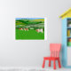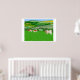 Illustration de trois vaches brunes et blanches paissant dans un champ vert avec vue sur les prés et la campagne au loin. Image disponible sur divers cadeaux et produits.