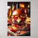 Plongez dans les saveurs vibrantes de Valence avec ce chorizo-hamburger indulgent. Une pâte de boeuf tendre et de chorizo mélangée, grillée à la perfection salée, est superposée avec du fromage Manchego fondu, des poivrons de piquillo rôtis et une délicate frotte d'aioli de paprika fumé, le tout niché entre un brioche à l'huile d'olive grillée. Un petit drapeau espagnol ajoute une touche de fierté espagnole, tandis qu'un décor de tapas et de sangria complète ce délice culinaire espagnol.