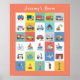 Affiche colorée et mignonne avec tous les camions et véhicules de transport que les petits garçons adorent manipuler et rêvent de conduire eux-mêmes. La typographie de police moderne "La chambre de Jeremy" peut être personnalisée via le menu d'édition. Superbe décoration murale pour la chambre ou la salle de jeux des enfants - ou comme cadeau pour une baby shower ou un anniversaire.