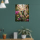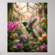 Un colibri en verre coloré rayonnant plane gracieusement dans un atrium d'orchidées tropicales, ses ailes brillant de tons de vert émeraude, rouge rubis, bleu turquoise, or ambre et violet. Un cadre métallique fin, une transparence lumineuse et une réfraction de la lumière brillante créent un chef-d'œuvre artisanal de style cathédrale plein de mouvement et d'élégance. Entourée de fleurs exotiques, de vignes suspendues, de feuilles brumeuses, de pollen flottant et de lumière solaire filtrée chaude, la scène semble vibrante et luxueuse. Parfait pour les intérieurs colorés, la décoration printanière, les amateurs d'oiseaux, les nurseries et les acheteurs de cadeaux à la recherche d'art mural premium joyeux.