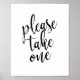 Un élégant panneau mariage de pointe, avec le texte "Please Take One" dans une police de script extroversée, la texture de brosse ajoute une sensation spontanée et ludique. La couleur arrière - plan peut être personnalisée selon vos besoins et préférences, s'il vous plaît contactez-moi si vous avez une demande spéciale.