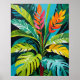 Ce design saisit la beauté luxuriante du feuillage tropical de manière audacieuse et stylisée. La composition se compose d'un agencement frappant de divers feuilles plantes, dont de larges feuilles monastiques, des frondes de palmier élancées et une hélioonia frappante. La palette de couleurs est riche et attrayante, avec des tons verts allant de la chaux à l'émeraude, accentués par des oranges vives, des jaunes et des roses.