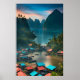 Un village de pêcheurs indonésien traditionnel est situé au bord de l'eau, entouré de collines verdoyantes et de rochers au coucher du soleil