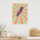 add a vibrant focal point to any room with this retro candy pop art poster. featuring a hand-drawn purple bonbon against a nostalgic pink and teal sunburst ray background, this high-quality print captures a charming kitsch aesthetic. the distressed texture and mid-century illustration style make it an ideal piece of wall art for kitchens, bedrooms, or offices looking for a bold burst of vintage color and nostalgic graphic design.