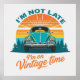 Vintage Time Ride T-Shirt. A retro-style illustration featuring a classic turquoise Beetle car in front of a vibrant sunset, surrounded by pine trees. The text humorously reads “I’m not late, I’m on vintage time,” highlighting a nostalgic and playful vibe.
