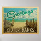 Ce design de carte postale vintage Greutings From Outer Banks comprend une plage de sable avec une belle eau turquoise de l'océan et au-dessus de la mer, un ciel bleu avec des nuages blancs lustrés. Dans un style de voyage vintage.