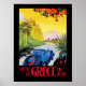 Affiche de voyage en français vintage faisant la promotion de la Grèce comme destination touristique en voiture.