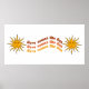 Un design rétro avec des soleils qui dit ici vient le soleil. Ce design semble vraiment efficace sur cette affiche