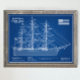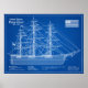 Cette affiche saisissante de style plan d'ingénierie représente le célèbre navire américain Flying Cloud, un voilier célébré pour sa vitesse remarquable et son design élégant. Construit en 1851 à East Boston par le célèbre constructeur naval Donald McKay, le navire représentait le summum de l'ingénierie des clippers pendant l'âge d'or du commerce maritime. Le travail au trait blanc sur fond bleu profond ressemble aux plans d'ingénierie traditionnels, donnant à l'image une qualité technique et artistique.