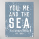 Un cadeau extraordinaire pour le ménage ou un ajout personnalisé cool à votre logement côtier, notre imprimé personnalisé avec cadre "You, Me and the Sea" en typographie de blocs sur un arrière - plan bleu poussiéreux en détresse. Personnalisez avec votre nom de famille et l'année de la maison de plage établie en lettres correspondantes au bas.