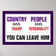 Pays sur Trump. Les gens sur la personnalité. Le trumpisme est une mauvaise relation toxique. Rappelez à vos voisins qu'ils peuvent quitter Trump et Trumpisme à tout moment, tout comme ils ont laissé un mauvais travail. Il est temps de mettre tout notre peuple au-dessus de son culte narcissique égomaniaque malin de la personnalité. Description du design : La couche arrière - plan est un violet foncé, signifiant placer les gens sur le parti politique. Au-dessus se trouve un rectangle blanc avec une bordure gris clair. Le tiers supérieur a le texte divisé en deux moitiés. Sur le côté gauche, on peut lire : "Pays sur Trump". Sur le côté droit, on peut lire : "Les gens sur la personnalité." Les mots pays et les gens sont tous deux en couleur violet foncé sans serif, le mot sur est en noir style écriture manuscrite, et les mots Trump et Personnalité sont en rouge sans serif police, les deux mots approximativement de la même taille. Parce que la personnalité est un long mot, cela signifie que le mot Trump est dans un texte relativement petit, ce qui rend son nom insignifiant. En dessous, en cela, en haut du tiers inférieur, est une ligne dans le même gris clair que la bordure du rectangle. En dessous de cette ligne, en gros noir, toutes les polices sans serif casquettes sont les mots, "Vous pouvez le quitter." Même conception de part et d'autre.