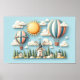 Une illustration charmante qui capture une scène ludique d'inspiration vintage dans un style mignon et stylisé en 2D plat. Deux ballons à air chaud charmants flottent sereinement dans un ciel rempli de nuages dodus et dessinés de manière cartoon. Un grand soleil rond brille joyeusement, ajoutant de la chaleur à l'ensemble de la composition. En dessous, le paysage est parsemé de moulins à vent rustiques et de pins, créant une atmosphère de campagne pittoresque. La scène entière est rendue dans des couleurs pastel vives, lui donnant une apparence fraîche et invitante. Le design adopte une esthétique plastique 2D, avec des lignes épurées et des formes simplifiées qui contribuent à son caractère fantaisiste et pétillant.