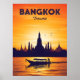 Une affiche stylisée de voyage vintage représentant l'emblématique temple Wat Arun à Bangkok, Thaïlande, au coucher du soleil avec un bateau sur la rivière.