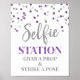 Affiche de station Selfie pour baby shower, douche nuptiale, ou mariage en blanc, violet foncé et parties scintillant argent confetti motif avec lettrage de style manuscrit. Idéal pour une douche de baby shower, mariage ou nuptiale.