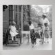 La vieille photo des années 1920 de petits garçons et filles avec une infirmière écoutant la radio antique dans un hôpital pour enfants, 1924. Deux des filles ont leurs jambes en fonte. Le garçon a son bras dans une fronde. Un des enfants est assis dans une charrue avec un cheval en plomb.