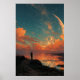 A solitary figure stands on a rocky outcrop overlooking calm waves, dwarfed by an enormous glowing crescent moon that fills the sky with soft luminescence. Dense stars sparkle across deep teal and indigo, blending into vibrant orange, rose, and golden clouds along the horizon where the last light of day lingers. Gentle surf reflects molten hues in rippled amber and crimson, creating perfect symmetry between earth and cosmos. The scene radiates profound solitude, cosmic wonder, quiet introspection, the threshold between day and night, and the sublime beauty of standing small before the infinite—perfect for meditation rooms, bedrooms, home offices, therapy spaces, modern minimalist decor, or as deeply symbolic gifts for dreamers, spiritual seekers, night-sky lovers, or anyone embracing personal reflection, awe, and quiet courage.