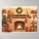 A heartwarming Christmas illustration showing a fireplace with hanging stockings, candles, wreaths and a decorated tree surrounded by gifts. The cozy glow and nostalgic color palette evoke a classic holiday feel.