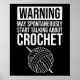 Warning - May Spontaneously Start Talking About Crochet. This funny crocheting lover accessory is a great idea for the crocheter in your life. Perfect for women, men, boys, girls, teens & kids who love to crochet & craft, and love yarn! If crocheting is your hobby, you're a yarn lover and you love crafting with a crochet hook and balls of yarn, then this crocheter design is for you! Includes a graphic of a crochet hook with a ball of yarn.