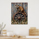 Cette peinture unique capture un raton laveur avec son regard curieux fixé en avant, assis sur une vieille roue patinée en bois. La roue repose sur un mur en bois texturé. Des herbes et d'autres plantes poussent autour de la base de la roue. L'expression "mignon mais ferreux" est affichée en haut de la page dans une police jaune ludique en bas.