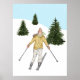 Bring the beauty of winter slopes into your home with this watercolor art print featuring Destei's original design of a woman skiing in a yellow color jacket among fir trees under a snowy blue sky. Perfect for cabin decor, mountain lodges or any winter-inspired space, this watercolor design print adds a cozy, seasonal touch while celebrating the joy of skiing and the outdoors.