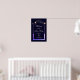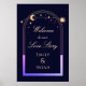 Welcome To Our Love Story Navy Blue Celestial Wedding Welcome Sign Celestial Cosmic Galaxy Space Poster Print Wedding Welcome Sign features a rainbow sun, moon and stars frame on a dark navy blue background. Inside the frame features the text "Welcome to our love story" with your names below in elegant peach calligraphy script. Designed for you by ©2024 Evco Studio www.zazzle.com/store/evcostudio