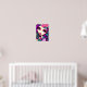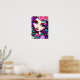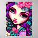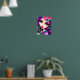 C'est une affiche amusante avec une illustration fantaisiste d'une fille en violet, rose et turquoise.