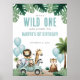 Welcome your guests in style with this Wild One party sign, redesigned with a fresh teal blue look perfect for any first birthday celebration. The front features soft teal blue balloons for a cheerful, playful feel, paired with a welcoming message or Name Is A Wild One! The text is shown in a bold rustic teal blue font mixed with a clean gray sans serif, creating a modern and inviting design.
