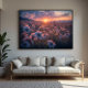 Magical sunset with wildflowers bathed in golden light. Sky in shades of pink and purple with mountains in the background. Ethereal and romantic image ideal for decor and creative projects. Bring serenity and natural beauty to your space with this enchanting landscape.