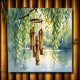 Une affiche illustrant des chimpanzés en bambou accrochés à un saule pleuvoir avec un arrière - plan du lac. Un cadre paisible.