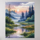 A peaceful watercolor depicting a calm river reflecting a glowing sunrise in soft pink and orange hues. Tall pine trees and a lone barren tree silhouette the misty forest shoreline, creating a tranquil, meditative atmosphere—perfect for relaxing wall art, greeting cards, and nature-inspired home decor.