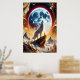 Un loup blanc se dresse sur un pic rocheux, hurlant à une grande lune bleue avec un halo rouge. La scène se déroule sur fond de montagnes enneigées et d'une forêt lointaine.