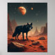 Loup noir sous ciel Alien - Un loup noir solitaire se dresse sur un paysage désolé, dans des tons rouges, avec ses yeux jaunes percevants fixés sur le spectateur. Le ciel est une marine, parsemée d'étoiles scintillantes et d'une grande lune orange brillante. Plusieurs corps célestes plus petits sont visibles, suggérant un monde alien. La silhouette du loup se distingue par son sable rouge vif et son terrain accidenté, créant un sentiment d'isolement et de mystère.