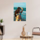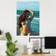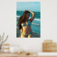 A swimsuit model in a patterned bikini poses by the ocean, basking in the sun. The waves gently lap at the shore under a clear blue sky.