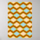 Des zigzags rouges et jaunes brillants entourent des diamants bleu clair et pêchent dans cet art/design abstrait coloré de Richard H. Fay.