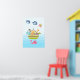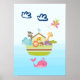 Une affiche avec une illustration de style nurserie mignonne d'une arche remplie d'animaux sauvages et un papillon volant au-dessus et une baleine amicale crachant de l'eau en dessous. Quelques nuages bleus flottent au passage. Sur un fond dégradé bleu clair.