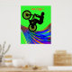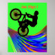L'action sportive et l'énergie des athlètes BMX sont capturées dans des silhouettes de figures d'action démontrant des tours extrêmes et des cascades sur leurs vélos. Les peintures numériques et les illustrations de ces ados et jeunes hommes comprennent des arrière - plans de couleurs vives et vives, des éclaboussures et des éclats de lumière pour souligner l'action. Ils se produisent aussi dans des scènes de rue grincheuses et pointues où les enfants gagnent leurs cris de rue montrant leurs compétences en vélo.