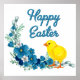 Image de Pâques mignonne avec un bébé poussin et des fleurs de Pâques bleues et les mots Happy Pâques au-dessus d'eux.